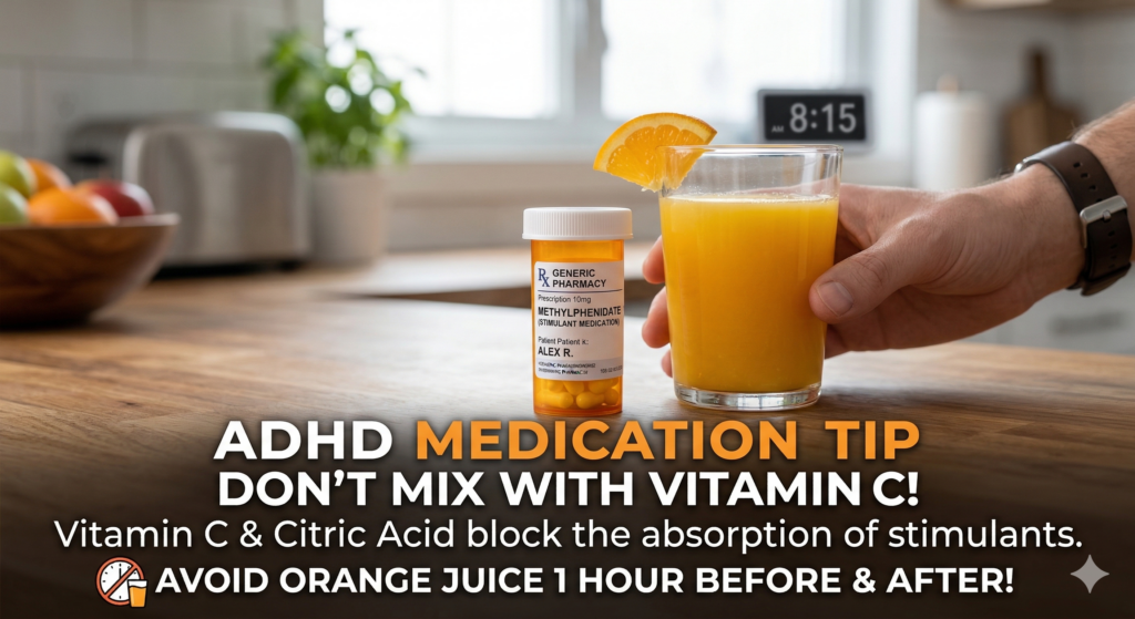 - Don’t mix with orange juice (or anything high in vitamin C): It sounds strange, but vitamin C and citric acid can block the absorption of stimulant medications. Avoid giving juice or citrus fruit about an hour before and after the medicine.